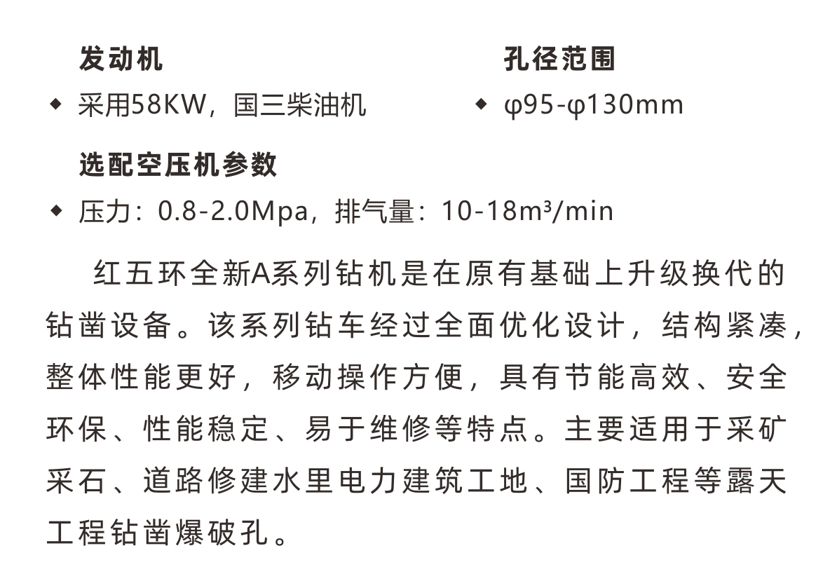 紅五環(huán)全新A系列鉆機(jī)是在原有基礎(chǔ)上升級(jí)換代的鉆鑿設(shè)備。該系列鉆車經(jīng)過全面優(yōu)化設(shè)計(jì),結(jié)構(gòu)緊湊,整體性能更好,移動(dòng)操作方便,具有節(jié)能高效、安全環(huán)保、性能穩(wěn)定、易于維修等特點(diǎn)。主要適用于采礦采石、道路修建水里電力建筑工地、國防工程等露天工程鉆鑿爆破孔。