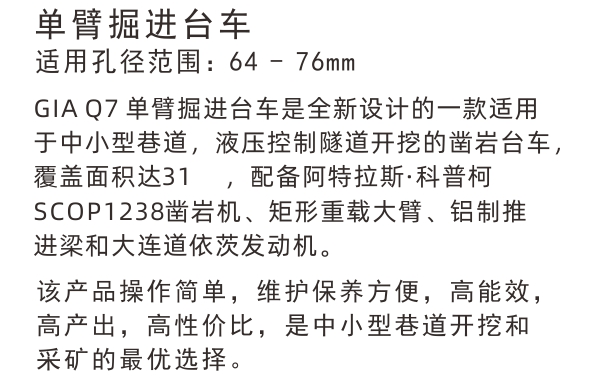 GIA Q7 單臂掘進(jìn)臺(tái)車是全新設(shè)計(jì)的一款適用于中小型巷道,液壓控制隧道開挖的鑿巖臺(tái)車,覆蓋面積達(dá)31 ,配備阿特拉斯·科普柯SCOP1238鑿巖機(jī)、矩形重載大臂、鋁制推進(jìn)梁和大連道依茨發(fā)動(dòng)機(jī)。該產(chǎn)品操作簡(jiǎn)單,維護(hù)保養(yǎng)方便,高能效,高產(chǎn)出,高性價(jià)比,是中小型巷道開挖和采礦的最優(yōu)選擇。